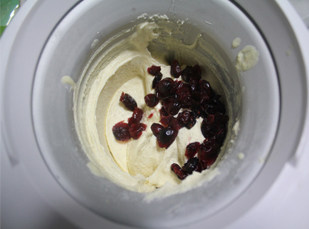 11. 制作快完成的时候,放入蔓越莓干,搅拌均匀就可以了!做好的冰激凌放入冰箱冷冻保存!