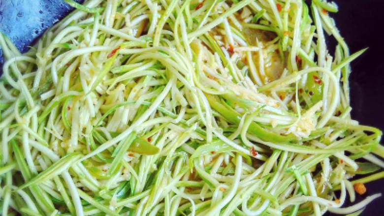 4. 往锅中倒入些许水,放入青南瓜翻炒
