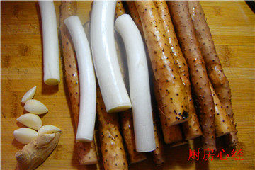 4. 起锅放炸好的葱油,爆香姜蒜,放入山药,调入酱油;蚝油;料酒, 清水,盐;糖,小火收干汤汁即可装盘,然后码上蒸好的大葱。