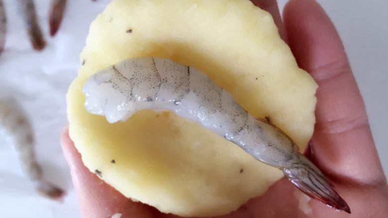 7. 取一团薯泥,先用手握成扁扁的圆饼状,中间用手指压一道浅浅的小沟,把虾放进去。
