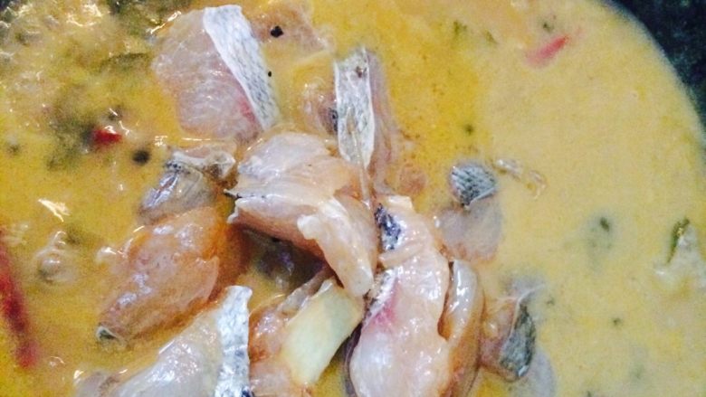 14. 汤留在锅中,把鱼肉放进开大火煮开后,关中火,煮一两分钟,(这看你切的鱼出薄,厚来定时间)