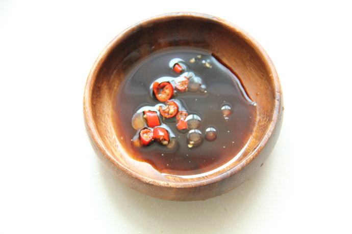 5. 调一个汁:香油半勺、生抽1勺、醋1勺、盐2克、美极鲜味汁几滴,放半个小红辣椒在里边。