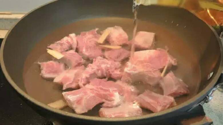 6. . 加入开水,没过排骨即可(冷水易造成肉质紧缩不易入味),再加入生抽、老抽。烧开后转小火炖20~30分钟。