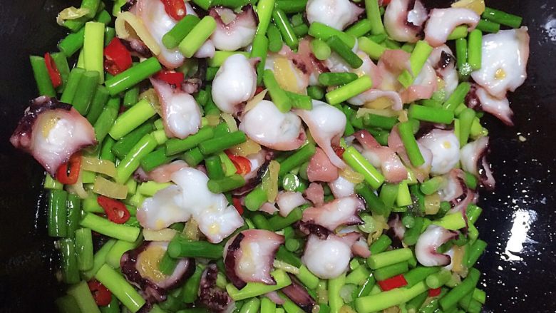 7. 待蒜苗炒得半熟时加入章鱼足和适量盐继续翻炒一会,开大火再加入少量清水翻炒形成少量汁水。