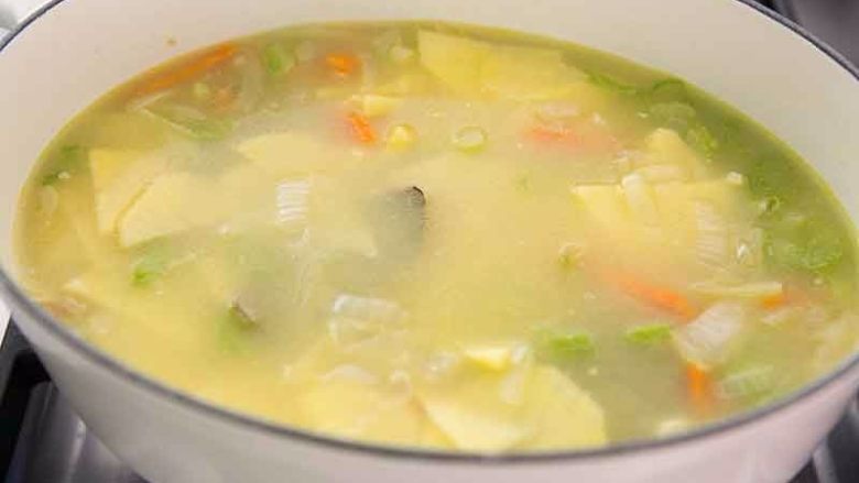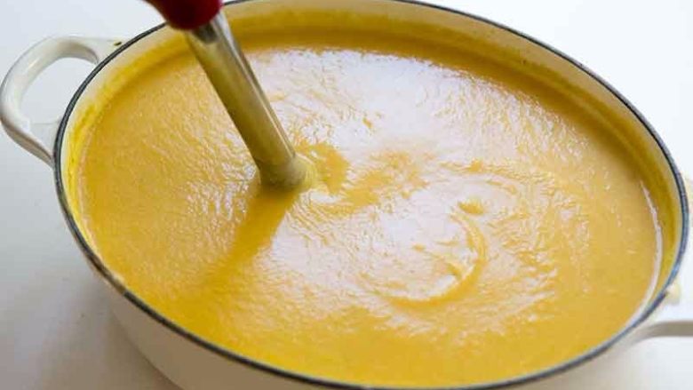 5. 关火,取出月桂叶。将煮好的蔬菜用搅拌器打均匀,直到完全光滑。