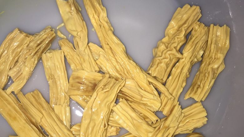 7. 所有调料炒香后,放入炸好的腐竹不停的翻炒,倒生抽,盐,糖。加点水开大火收汁。