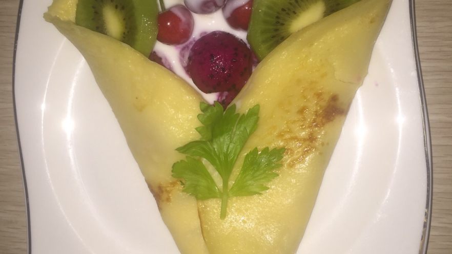 10. 然后把摊好的饼装进盘中,两边各少折去一点点,给里面加入红心火龙果,香蕉,猕猴桃,樱桃,酸奶,最后给对折的中间放一点芹菜叶做装饰。