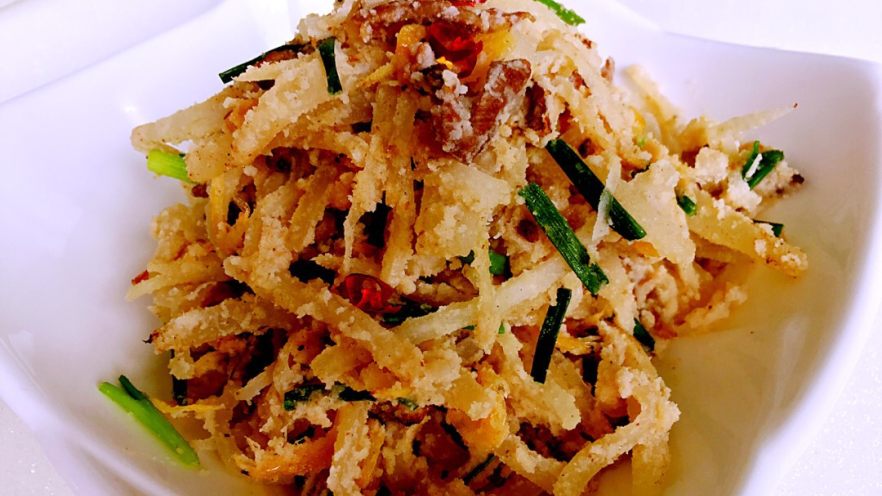 5. 下萝卜丝翻炒片刻,炝料酒,加适量盐调味后炒匀。