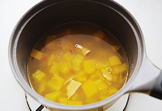 8. 加入清水,大火煮开转中小火,盖盖子煮15-30分钟,将汤汁煮成黄色;
