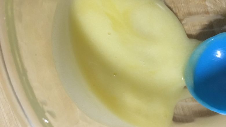 13. 用手动打蛋器搅拌均匀,提起打蛋器时面糊应可顺畅地流下,蛋黄糊就做好了