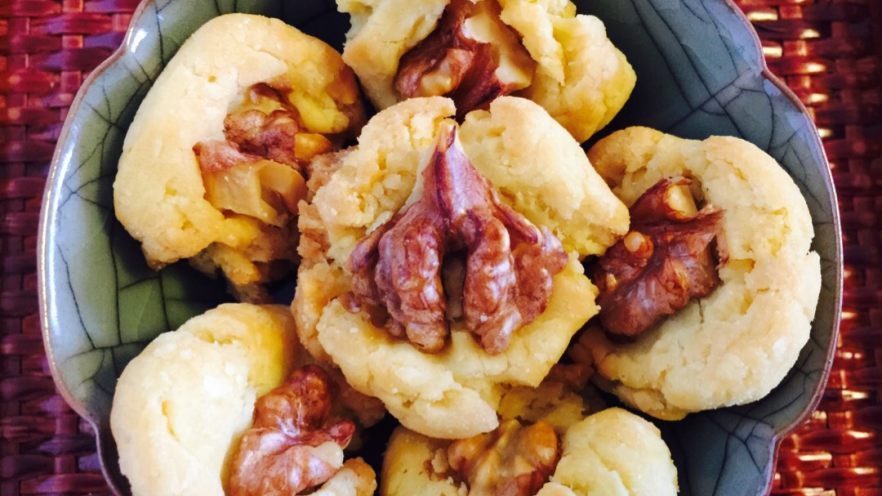 核桃酥,将分成小段的面团搓成圆形,取一颗核桃仁,用大拇指按压在面团中间即可。