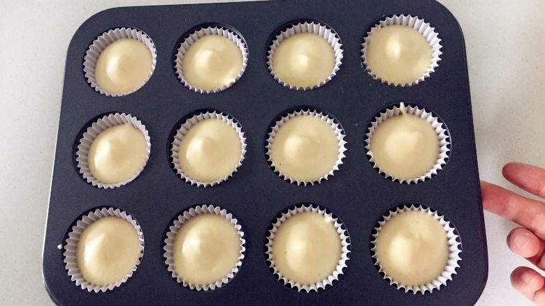 14. 入模烘烤——纸杯中8分满就好了,烘烤的时候会有一些膨胀。装好后把玛芬模具拿起轻震几次,主要是为了把较大的面糊震出来,不然最后成品蛋糕中间可能会出现一些大洞。 》不要装太满,宁愿大家放少点,太满了后面膨胀出来太多,纸杯边缘支撑不住,烤不成光滑的表面。