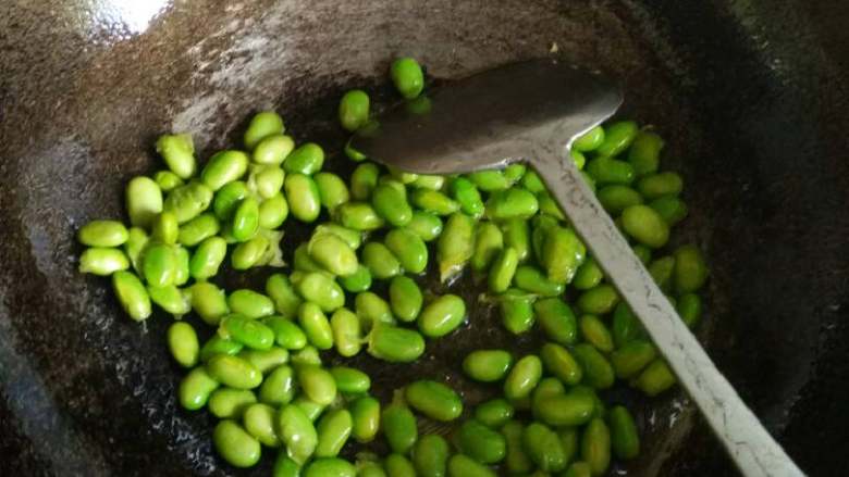 8. 热油倒入毛豆翻炒