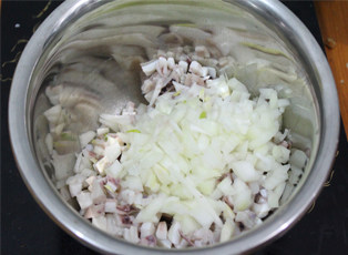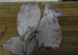 1. 鱿鱼去内脏和鱿鱼须,把表面黑皮撕掉,清洗干净。