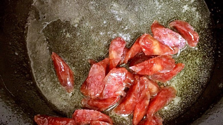6. 先放入香肠煸炒一下,再放入芹菜一起煸炒。