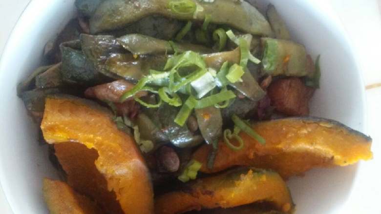 6. 锅底收到剩一点汤汁时就好了,把南瓜先拿出来,剩下的豆角放入葱花,十三香拌匀即可出锅。上面也可放一点葱花也可不放。