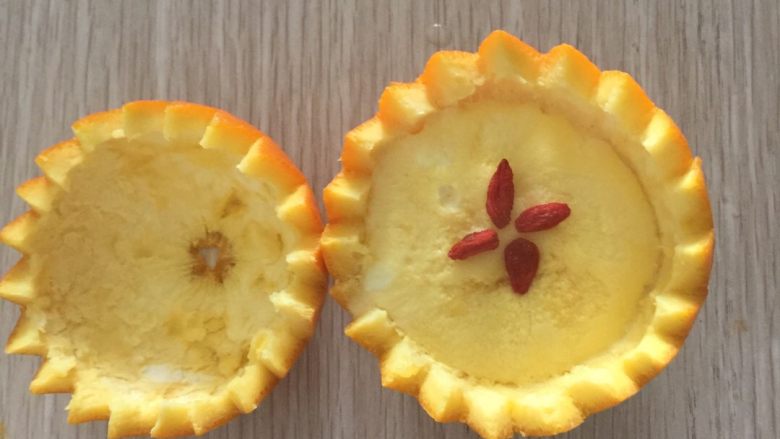 6. 大概蒸20分钟左右,把柳橙蒸蛋拿出来,放在装上面,撒上四颗枸杞即可。
