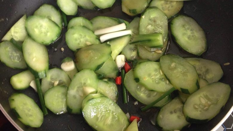 4. 油锅放油爆香蒜粒和指天椒,然后加入青瓜爆炒10秒加入适量水煮2分钟