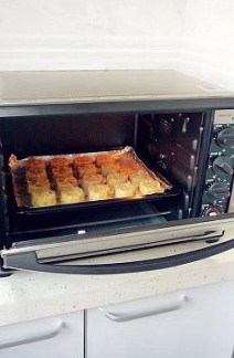 6. 鱼饼全部做好后将烤盘放入预热好的烤箱,启动风机,上、下火都是150度,烘烤20分钟即可。