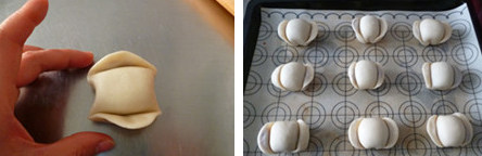 5. 取一个油皮压扁后,包入一个油酥,收口捏紧(必须完全捏紧哦)朝下放在烤盘上,依次做完18个。