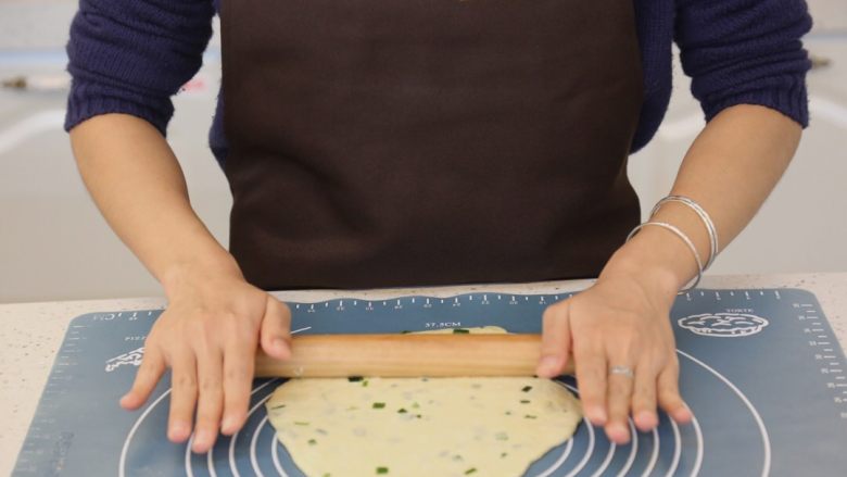 4. 4.香葱切碎后脱水加入,充分揉匀面团,使香葱碎和面团混合均匀。