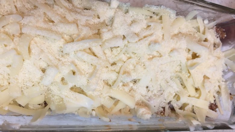 19. 肉酱、白奶汁、煮好的面片三种材料反复加,一共约10层,最后放奶酪,200度烤箱烤30分钟