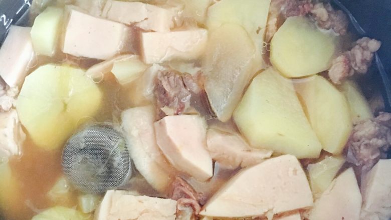 8. 电高压锅时间到打开放入芋头、土豆、盐、老抽再加盖炖十分钟