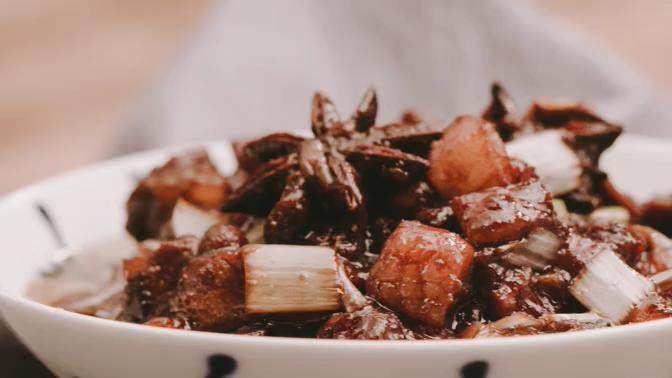 3. 热油锅中倒入肉沫、姜末、八角、葱段儿,翻炒