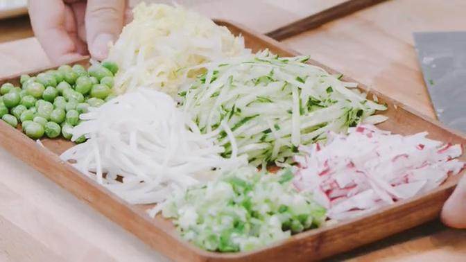 8. 水萝卜丝、黄瓜丝、青蒜块、娃娃菜丝、豆芽、青豆摆盘