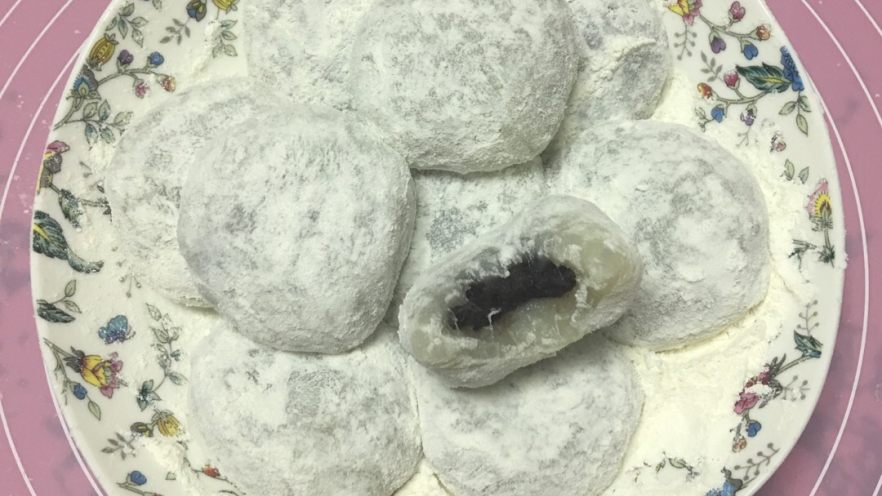 5. 将面团分成40g左右一份,包进20g左右豆馅,裹上熟糯米面粉即可