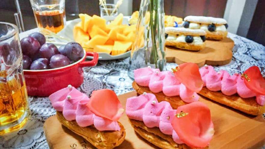9. 烤箱180度预热,放入挤好的泡芙烤35分钟左右,注意上色情况,按须调整温度,中途不要开烤箱。 烤好的泡芙皮晾凉后灌入香草吉士酱,再进行表面装饰。