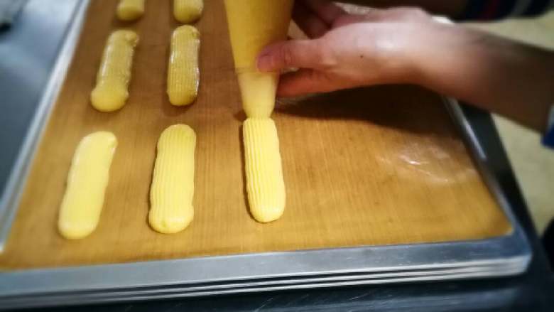 8. 挤出自己喜欢的造型,我挤的是长度约10cm的长条。注意每个泡芙中间留间隙。
