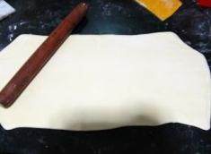 7. 折了几次后,黄油几乎全部融合于面片中了,最后将面片擀薄后,不需对折。
