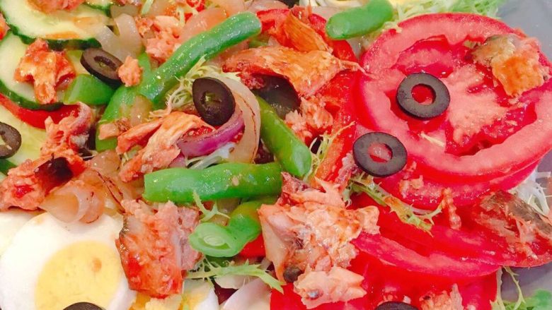 9. 所有的摆盘,最后加上凤尾鱼,和黑橄榄混合,加入普罗旺斯酱拌匀。搞定!