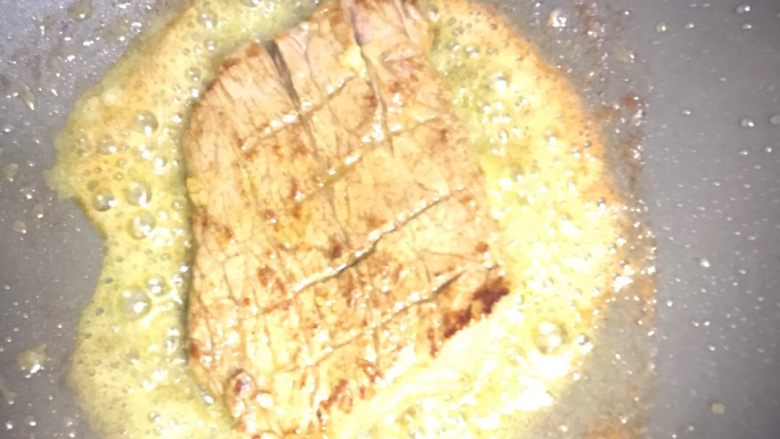 4. 将腌制好的牛排放于平底煎锅中(中火煎),每隔10秒翻一面,煎好牛排