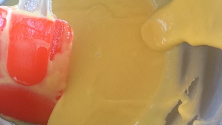 12. 打好的蛋白分4次搅拌均匀(翻面糊时像炒菜一样由下往上)