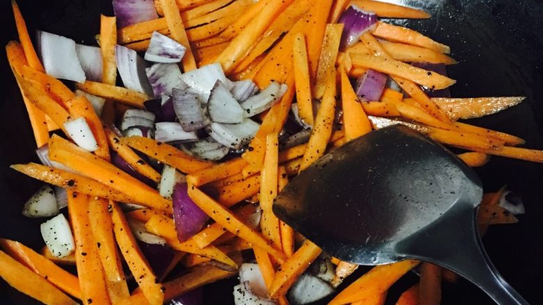 5. 加入洋葱翻炒。洋葱微微透明时,加入胡萝卜翻炒至胡萝卜稍变色,烹少许料酒。