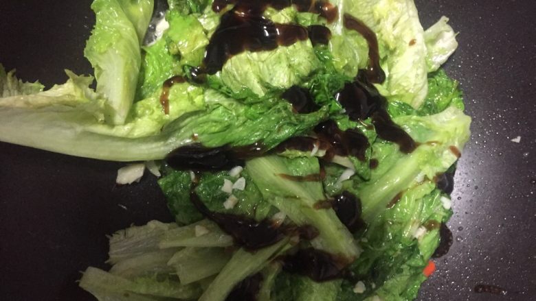 4. 用蒜末和一个辣椒丁爆香,放入生菜,,将生菜炒软,再放入盐