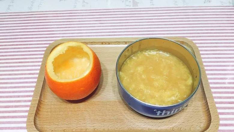 - 碎碎念:,1.考虑到宝宝一起吃,就在鸡蛋的步骤去掉了蛋清,一岁前不给宝宝吃蛋白,主要是宝宝的消化系统善未完善,而蛋白易过敏且不好消化,大人吃的话用蒸蛋即可;,2.注意打蛋的水一定要是温的纯净水,这样蒸出来的蛋才会很光滑;,3.蛋和水的比例约1:1.5,和日常水蒸蛋一样;,4.如果没有蛋黄分离器,还有一个小窍门,用可乐瓶口对着打出的蛋黄吸;,5.取橙肉的时候莫太大力,以防弄破橙子皮。