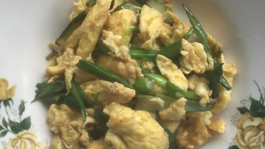 5. 下鸡蛋和大葱一起翻炒放入适量盐调味盛盘完成