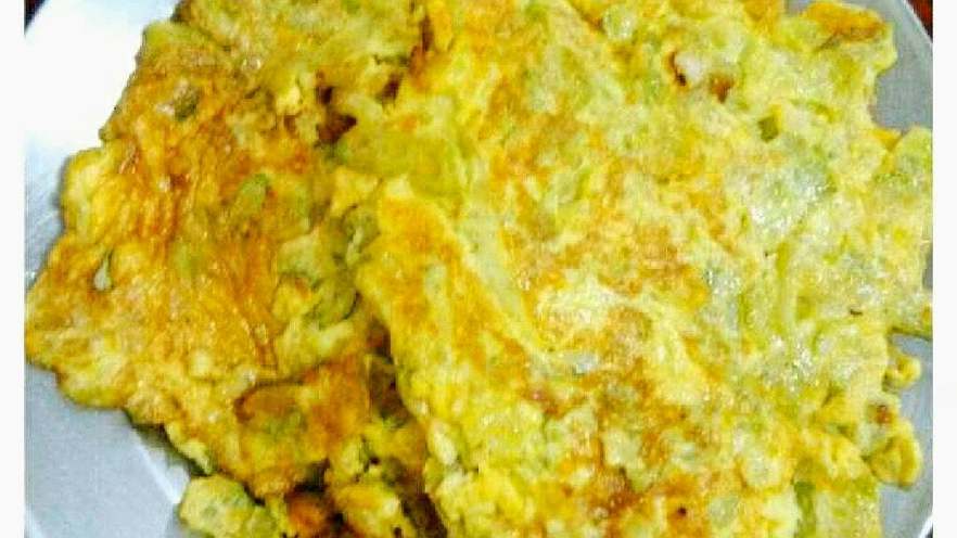 7. 锅里重新倒入点油,油温上来马上倒入苦瓜鸡蛋液,转中小火,慢慢煎成饼形,火太大容易烧焦