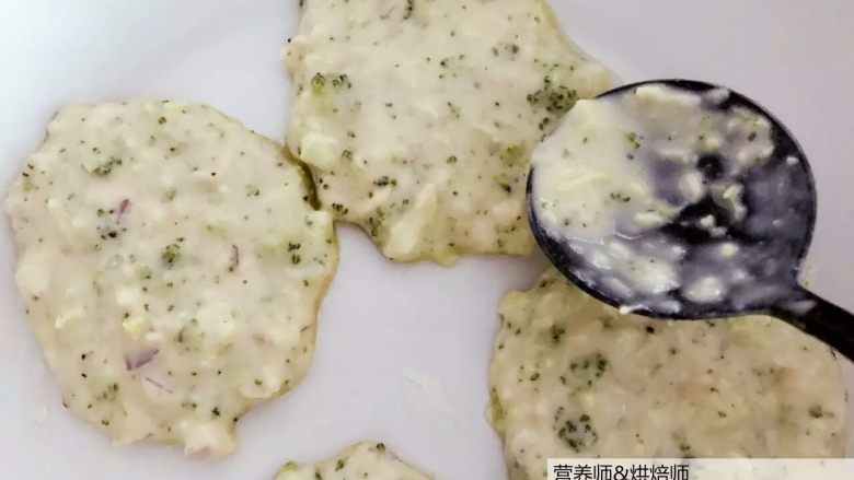 6. 用平底不沾锅,提前烧热,刷薄薄一层植物油,用勺子一勺一勺把西兰花鸡丝面糊放入,并压成圆形,尽量压薄一点。下锅时先不要动,用小火慢慢煎,等晃动平底锅,小饼可以跟着动(如果有粘住的,可以用锅铲帮忙下),饼的边缘已变色时,就可以翻面了 》不要用很多油哈!