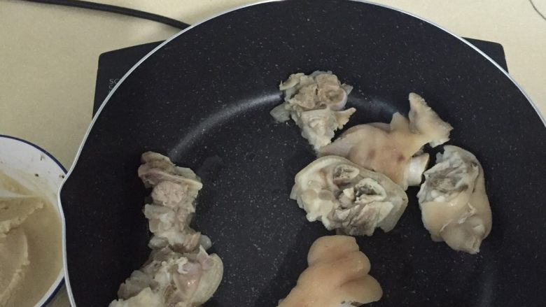 2. 锅里烧开水,丢入生姜、葱段和砍好的猪脚,煮五分钟,捞出,生水冲掉浮沫,放盘里备用。