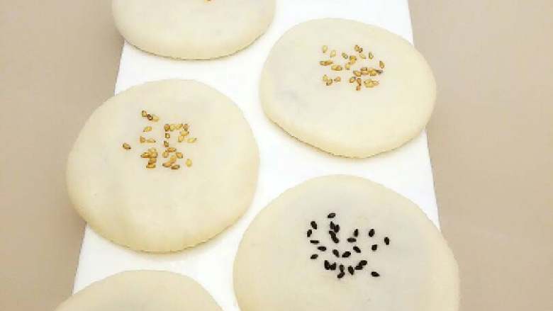 3. 将面团滚圆按扁包入馅料,封口,按扁,整形,撒上芝麻