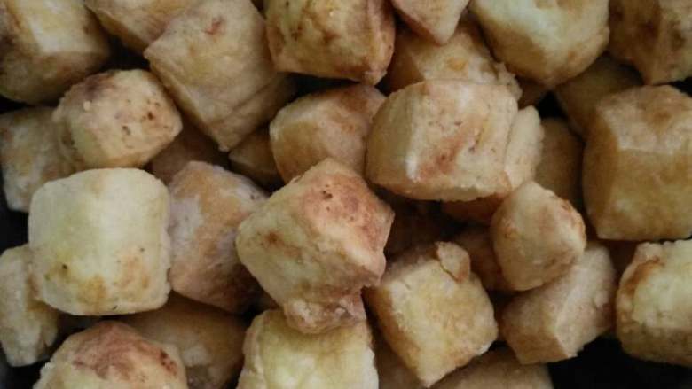 5. 豆腐切块,焯水,蘸淀粉炸到金黄。