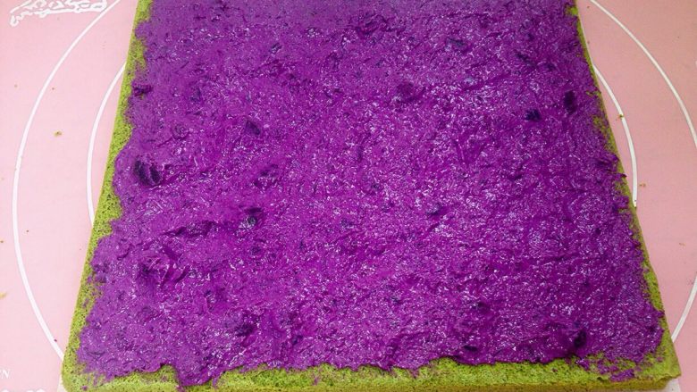 15. 蛋糕远离自己的一边用刀斜切出45度斜边。把紫薯糊均匀地涂抹在蛋糕上面。