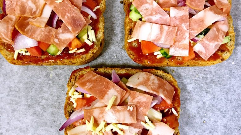 3. 在烤盘上铺上硅油纸,将3片全麦核桃吐司平铺在硅油纸上,表面涂上适量的番茄酱(有披萨酱最好)
