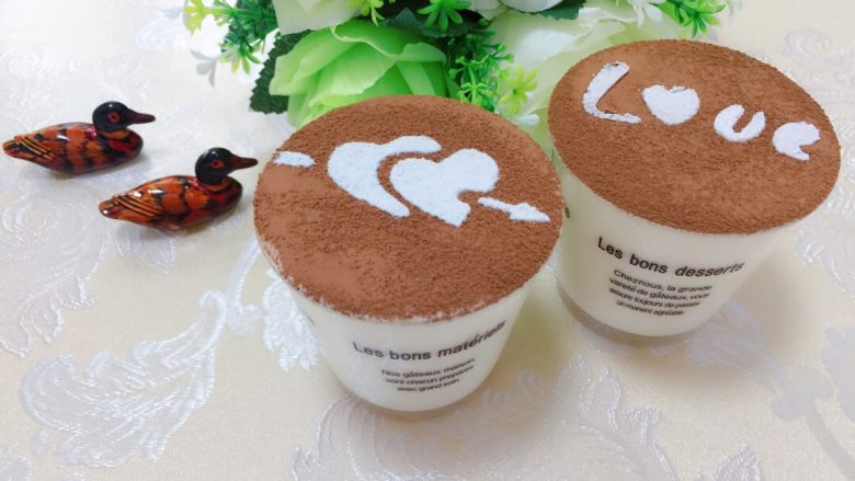 10. 完全凝固后取出。用吹风机沿着模具边缘吹几圈,放在比模具高的杯子上,往下用力即可脱模。表面撒一层可可粉。