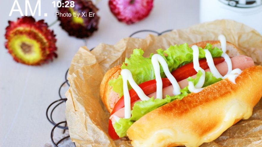 12. 准备一瓶丘比沙拉酱,在面包胚上挤上波浪纹装饰