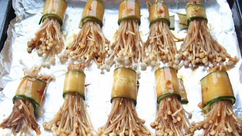 黄瓜和金针菇连功效都惊人的一直,都能促进新陈代谢,都能抗肿瘤,都能降低血压,真是天生姐妹花。常吃黄瓜金针菇不仅能去消除疲劳而且能安神定志哦,对于平日工作压力的人来说,吃上一盘黄瓜金针菇是不错的选择,当然也能使用黄瓜炒金针菇,凉拌等等。这次我做的是青瓜金针菇卷做法很简单,青瓜包起金针菇、扫上调料进行烤制就可以啦。
